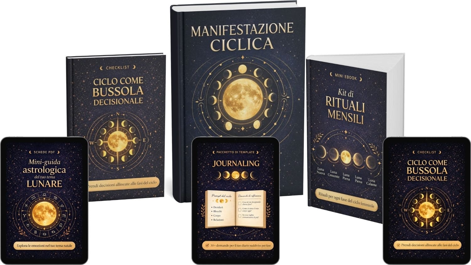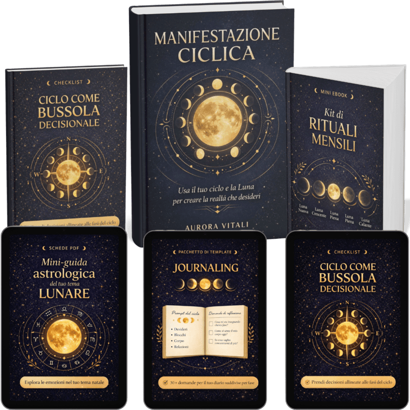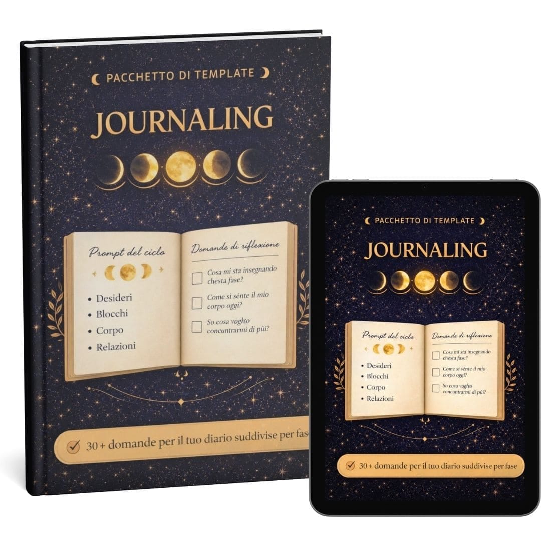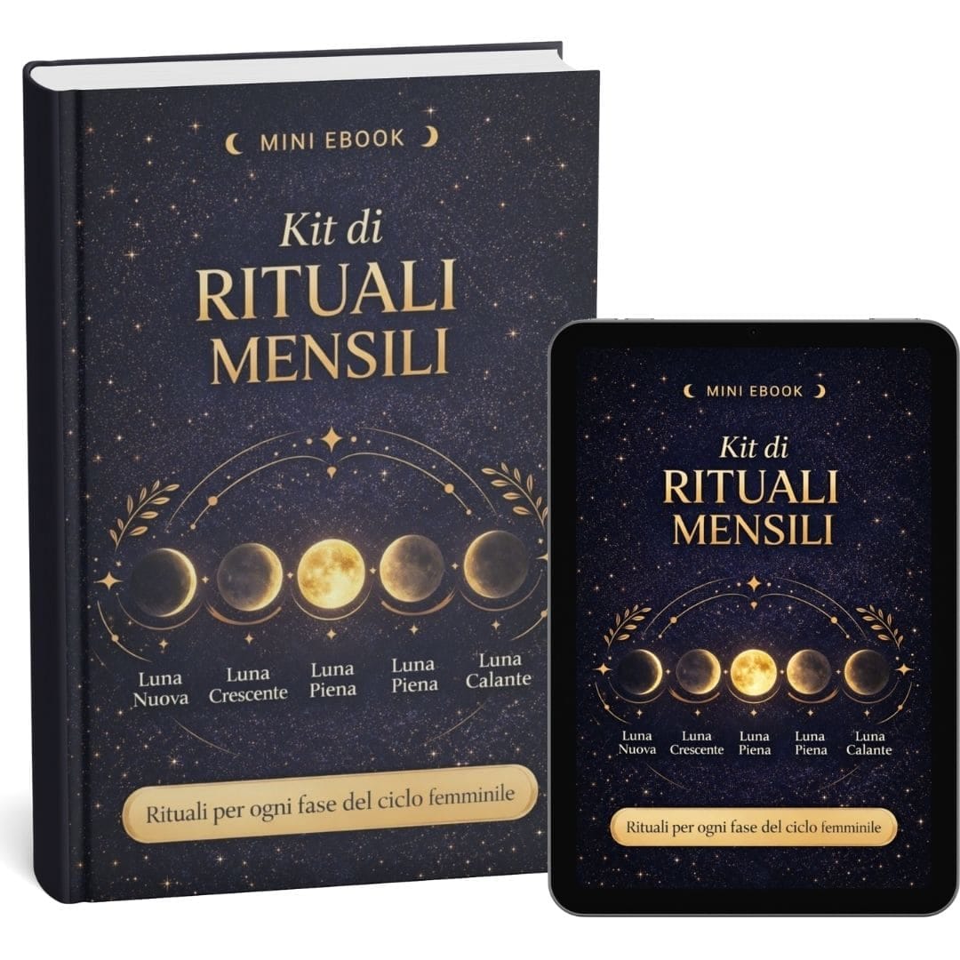 🎁 Bonus #2 — Mini eBook “Kit di rituali mensili” — Rituali guidati per Luna Nuova/mestruazione, Crescente/pre-ovulazione, Piena/ovulazione, Calante/pre-mestruo. Sono rituali brevi e semplici (anche 10 minuti) così non devi inventare nulla: apri, segui e ti riallinei.