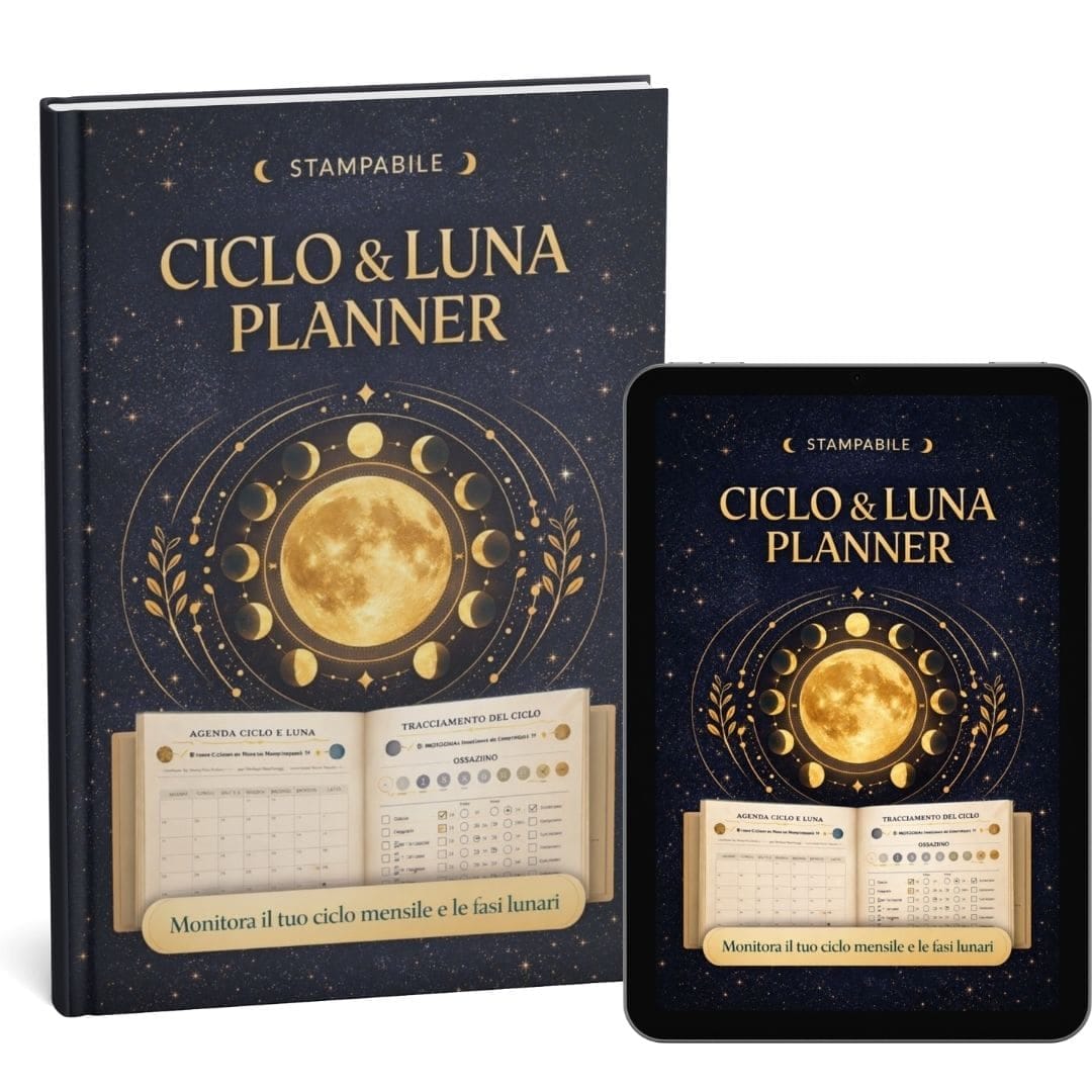 Non un planner qualunque, ma una mappa mensile e annuale dove incroci: giorno del ciclo, fase lunare, energia, umore e azioni di manifestazione, così inizi a vedere pattern reali.